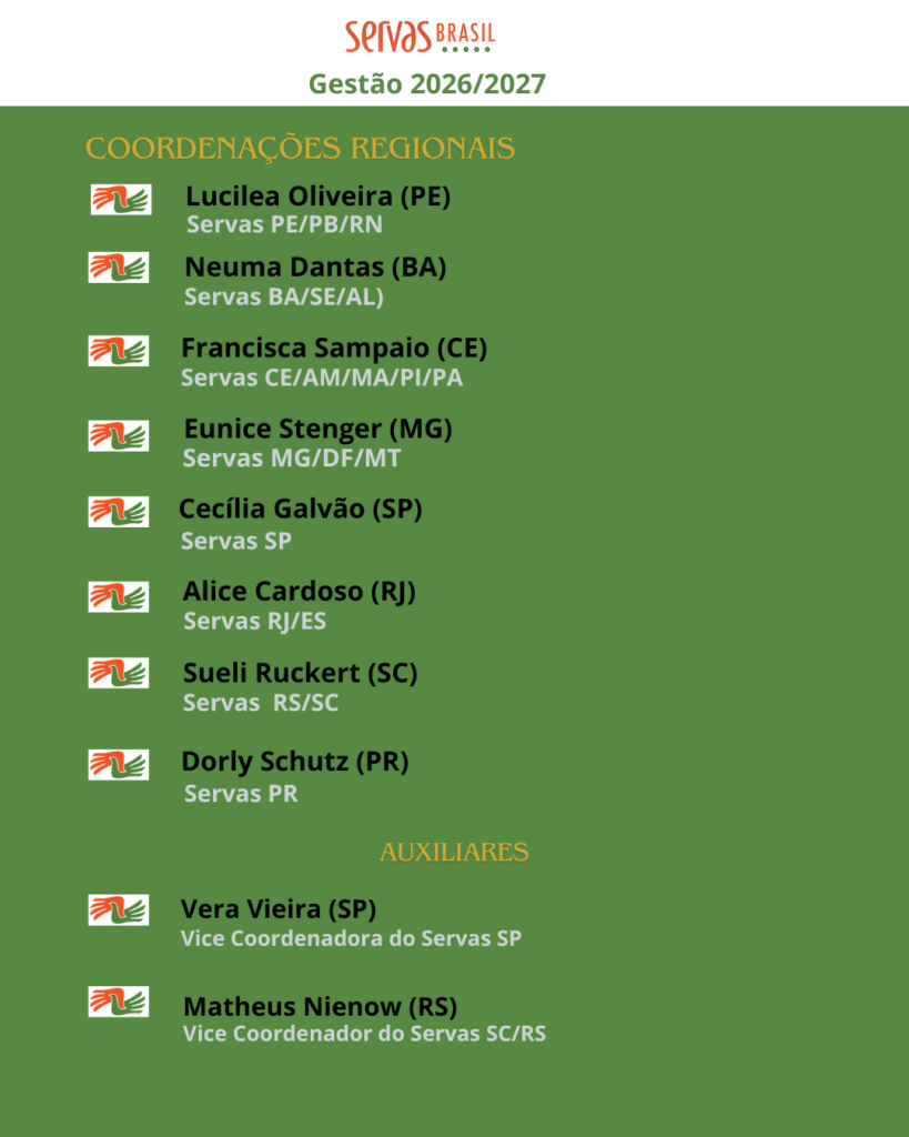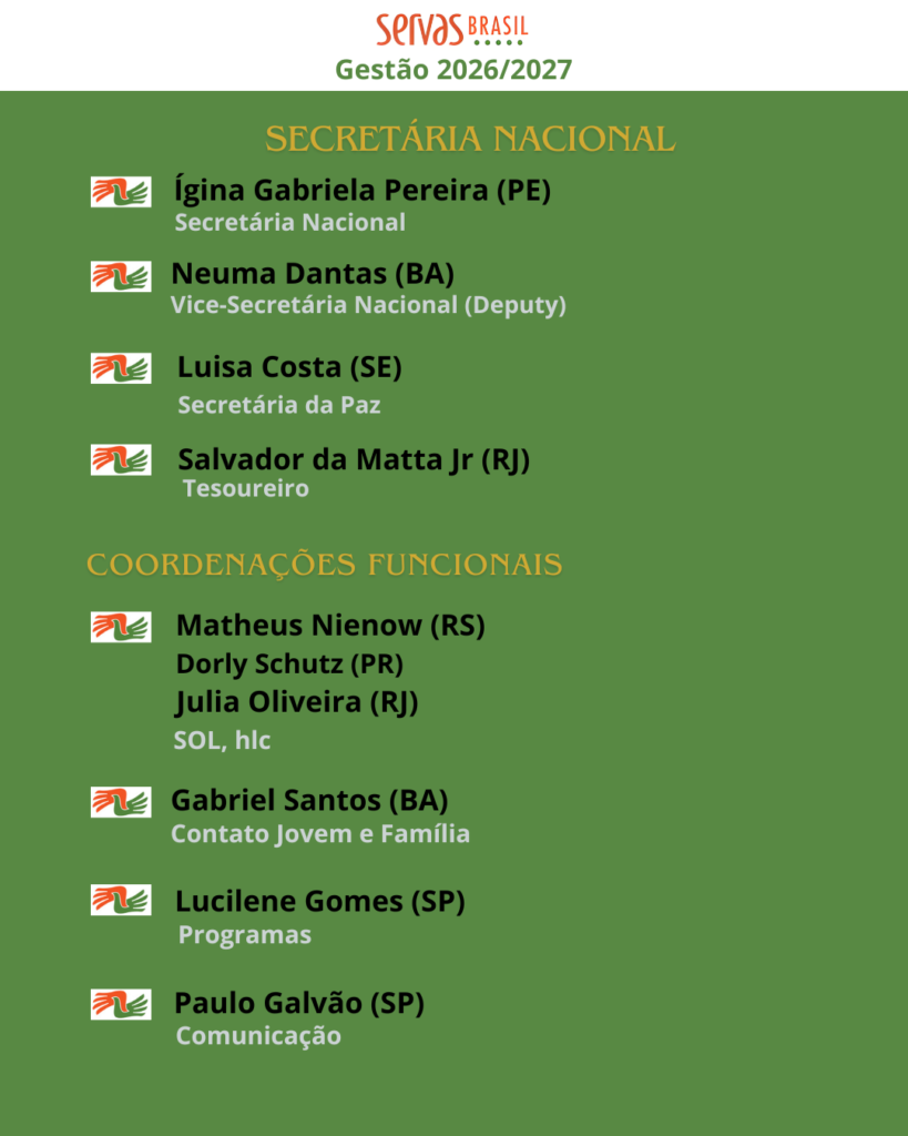 Durante a Assembleia Nacional realizada no dia 21 de novembro de 2025, no evento EnFortaleza 2025, foi eleita a nova gestão do Servas Brasil, composta inteiramente por voluntários comprometidos com a missão da organização, em um encontro que contou com a participação de pessoas tanto de forma presencial quanto remota pelo Google Meet.